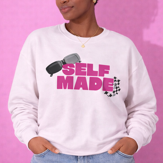 Self Made Crewneck Sweatshirt - Bold Pink Graphic with Sunglasses & Checker Accent